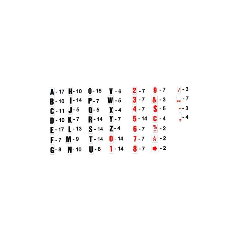 - Kit quantity: 378 characters black letters, red numbers and symbols.