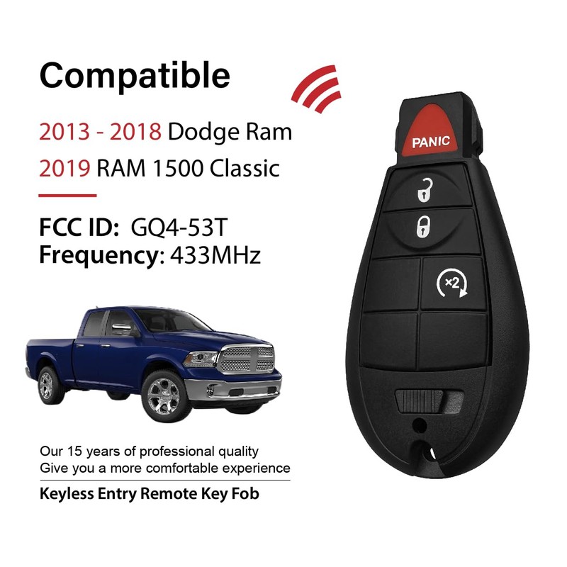 2 Keylessbest Replacement for Dodge Ram 1500 Classic Key Fob Remote Control 2017 2018 2019 4 Buttons 433MHz GQ4-53T