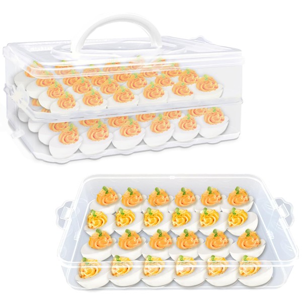 2-Layer Deviled Egg Carrier with Lid,Deviled Egg Trays with Handle,Stack Portable Stackable Trays,Clear Devil Egg Cotainer 48 eggs Holders, for Thanksgiving Day, Easter, Holiday,Parties and Kitchen