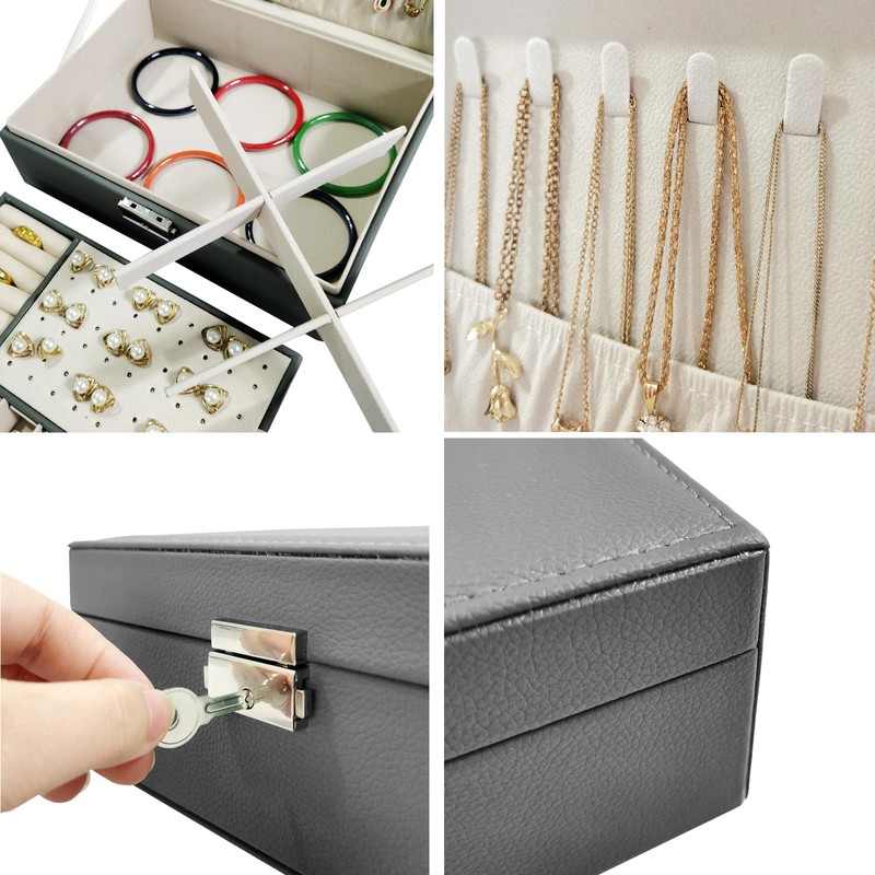 2 Layers PU Leather Jewelry Box Jewelry Organizer Box for Girls Gift Earring Organizer with Lock Jewelry Case Removable Tray for Necklace Earring Ring with Polishing Cloth and Jewelry Bags (Gray)