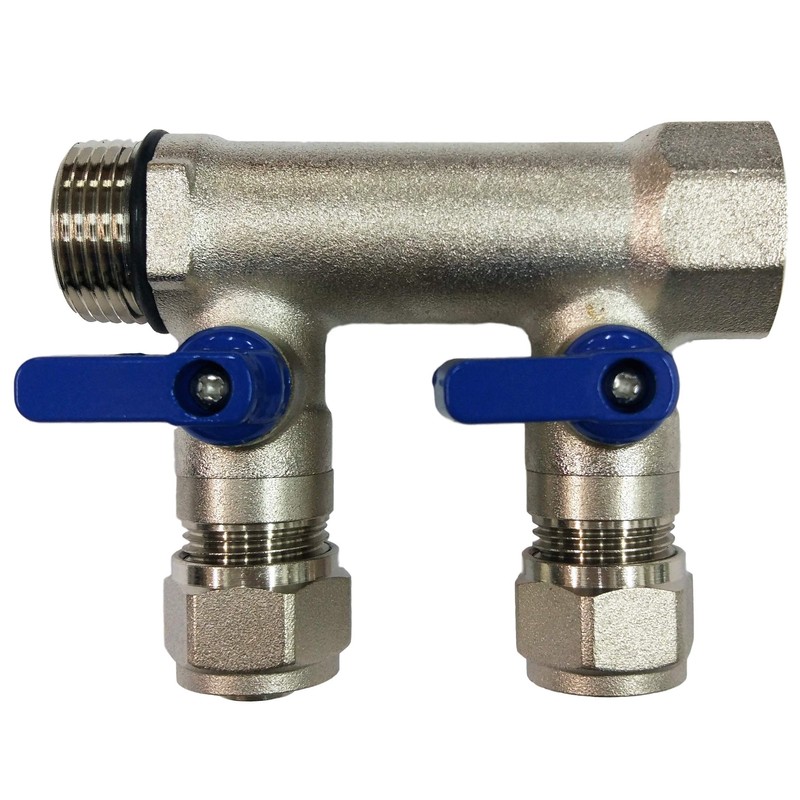 2 -Loop/Port Ball Valve Brass Pex Manifold (3/4" trunk) for 1/2" Pex Tubing, blue handles