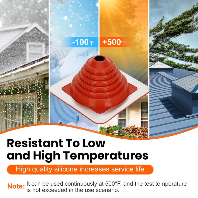 - HIGH and LOW TEMPERATURE RESISTANCE: The bottom of the #2 Metal Roof Stove Pipe Flashing Boot is made of high-quality aluminum material, and the surface is made of artificial high-quality EPDM rubber. Test temperature: maximum temperature: +500 °F, minimum temperature: -100 °F. #2 High Temp Roof Vent Boot Kit can provide Waterproof, Anti-Oxidation, UV Resistance, Anti-Corrosion, without cracking and more. High quality silicone materials have excellent characteristics such as high and low temperature resistance, high tensile strength, and high tear strength, thereby improving service life and safety performance. Note: Do not exceed the testing temperature in the usage scenario.