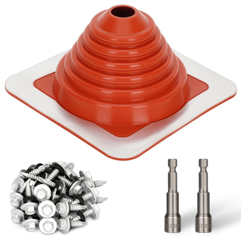 - PACKAGING and SIZE: #2 Metal roofing pipe flashing Boot packaging include: #2 High Temp Roof Flashing Vent Boot x1,8mm Hex Bit Socket x2, Roofing Stitch Screws 50 PCS. #2 Flexible Silicone Roof Jack Pipe Boot Square Base Size:Length: 6.1 ", Width: 6.1 " Height: 2.75 ".