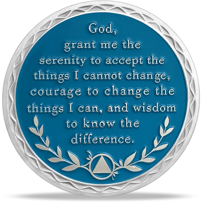 - Back side of aa coin and medallions features inspirational script "Serenity Prayer" in gentle blue background and bottom is AA Symbol surrounded by branches of tree of life.