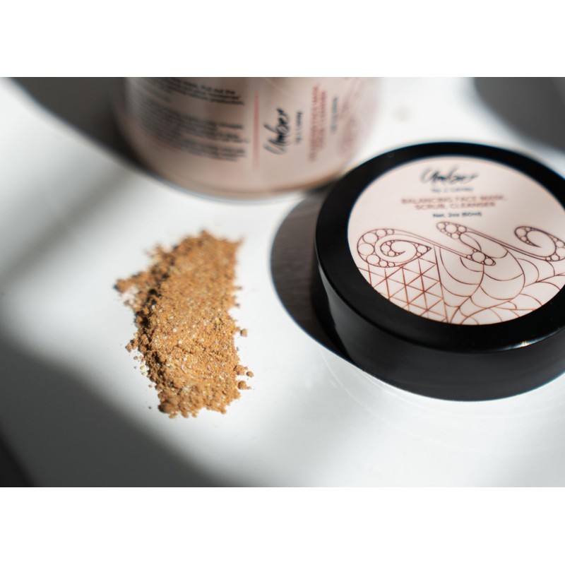 How to Apply Balancing Face Mask Scrub: Step 1. Apply 1 teaspoon of the powder to your desired liquid: rose water, yogurt, honey, apple cider vinegar, or aloe vera. Mix the two elements together until you get a cake batter-like consistency. Step 2. Apply to the face using a brush or spatula. Avoid contact with eyes. Step 3. Leave the mask on for 10-20 minutes, you’ll start to feel a cooling sensation. Step 4. Add water to your hands and begin to rub the mask off in a circular motion. Step 5. Repeat step 5 until the mask is fully removed. Step 6. Applying Umber’s Facial Moisturizer for best results. Exfoliating Face Mask, Face Scrub and Gentle Face Cleanser Description: Exfoliating Face Mask, Face Scrub and Gentle Face Cleanser Description: One, 2 Fluid Ounce (59.14ml) PET jar. Yields 6-8 face masks. This product is a hydrating face mask that pulls out impurities while using therapeutic oils to help balance hormones. The Balancing Masks has a natural cooling effect for irritated skin which makes it great to use on a hot day. It reduces common skin toxins and is a gentle exfoliant that helps reduce ingrown hairs. Hydrates Skin Aroma theripy to balance cortisol Helps keep skin cool on hot days Inproves acnes Treats damaged skin