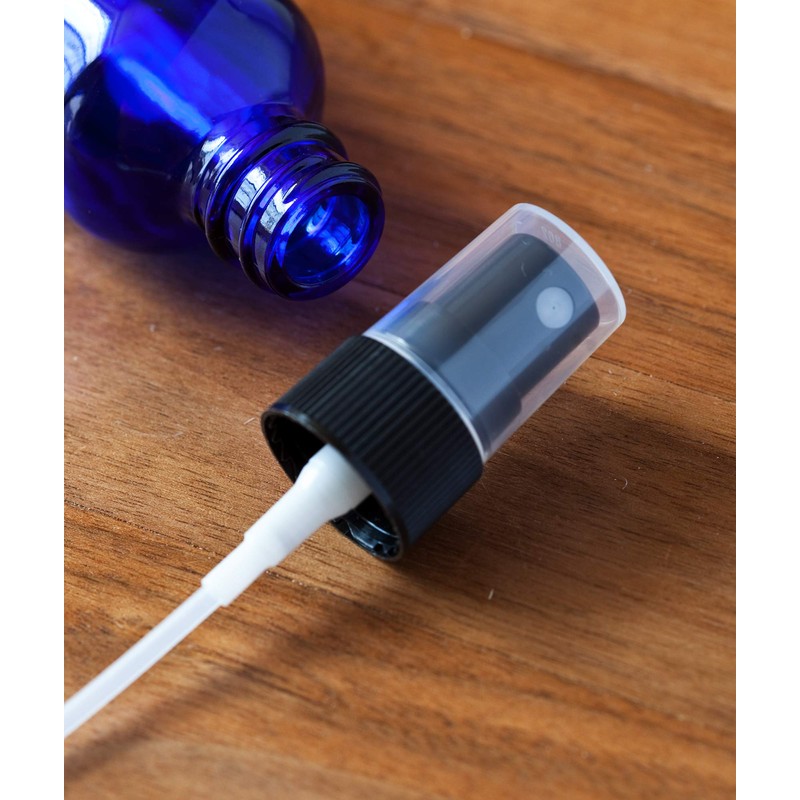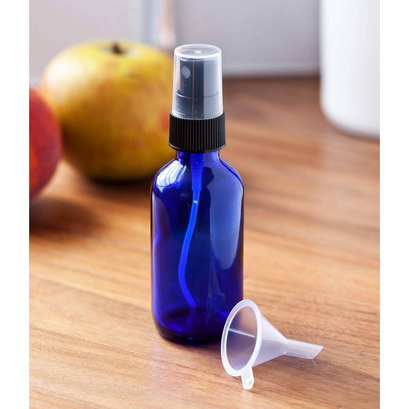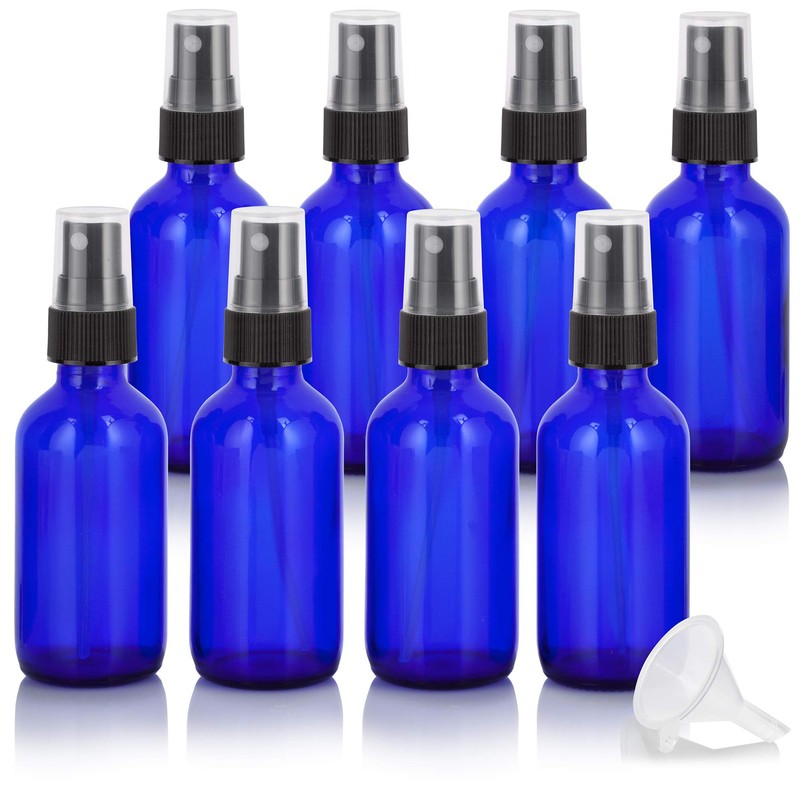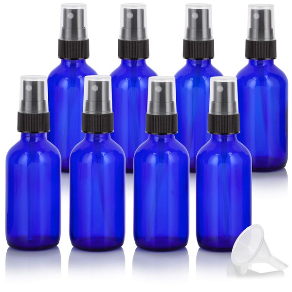 2 oz Cobalt Blue Glass Boston Round Fine Mist Black Spray Empty Bottle (8 Pack) + Funnel
