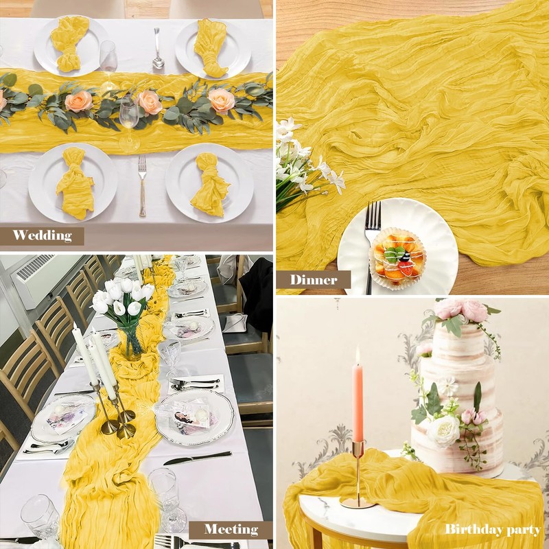 - 【Package Included】2 pcs Light Yellow Cheesecloth Tablecloth (35" x 120"/10ft). The design is elegant and beautiful, and the workmanship is exquisite. The table runner has a rustic and elegant look that pairs well with bohemian, farmhouse, chic, or other modern themes.