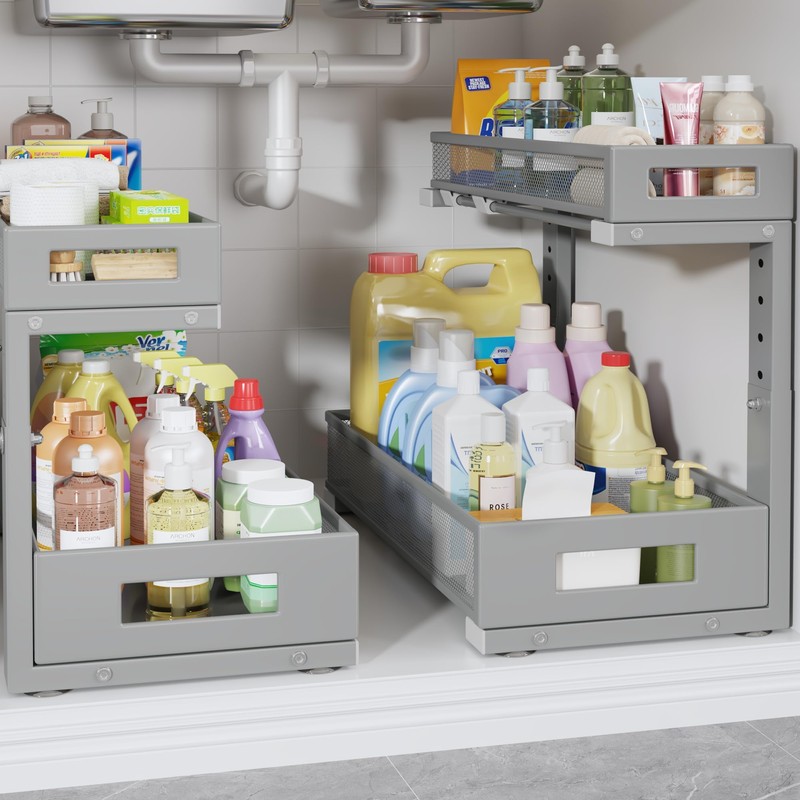 - 【2-Tier Pull-Out Design for Easy Access】This under-sink organizer features a double-layer pull-out design, allowing you to easily access items at the deepest part. The upgraded, thickened iron circular sliding rails ensure a smooth and seamless pulling experience, making each use effortless. The unique pull-out locking mechanism effectively prevents the drawers from being completely pulled out, avoiding the risk of items falling or structural damage caused by over-pulling, ensuring safer.