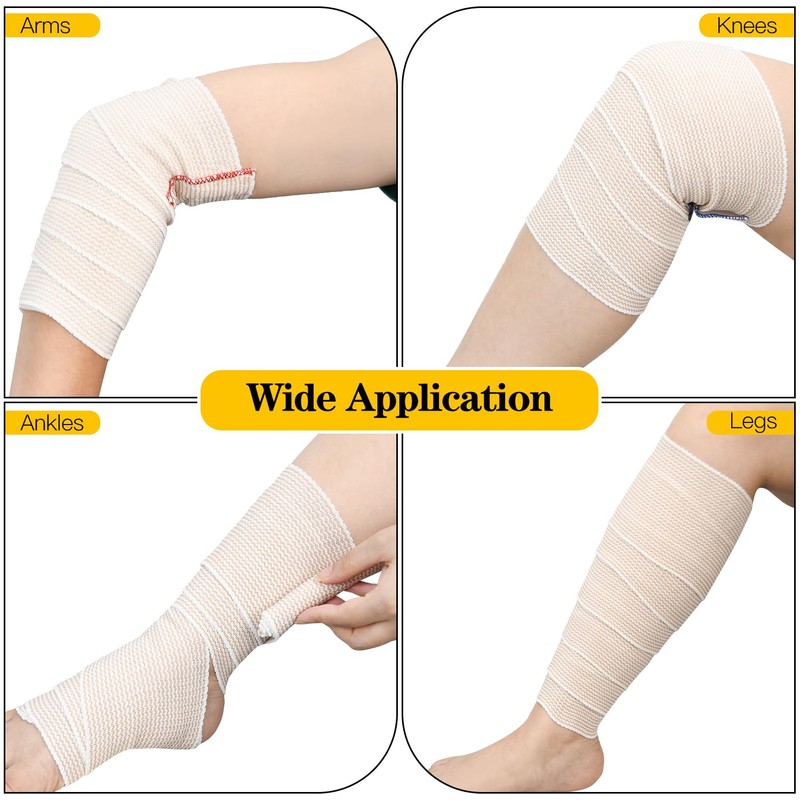 - 【Wide Application】- Elastic bandages are great for legs, ankles, knees, wrists, arms, abdomen and body. They help relieve body aches, sprains, strains and swelling.