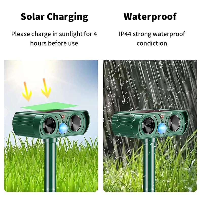 • Solar Powered Animal repeller: Harness the power of the sun with our animal repeller. It's fully solar-powered, requiring no batteries or electricity, making it cost-effective and easy to maintain