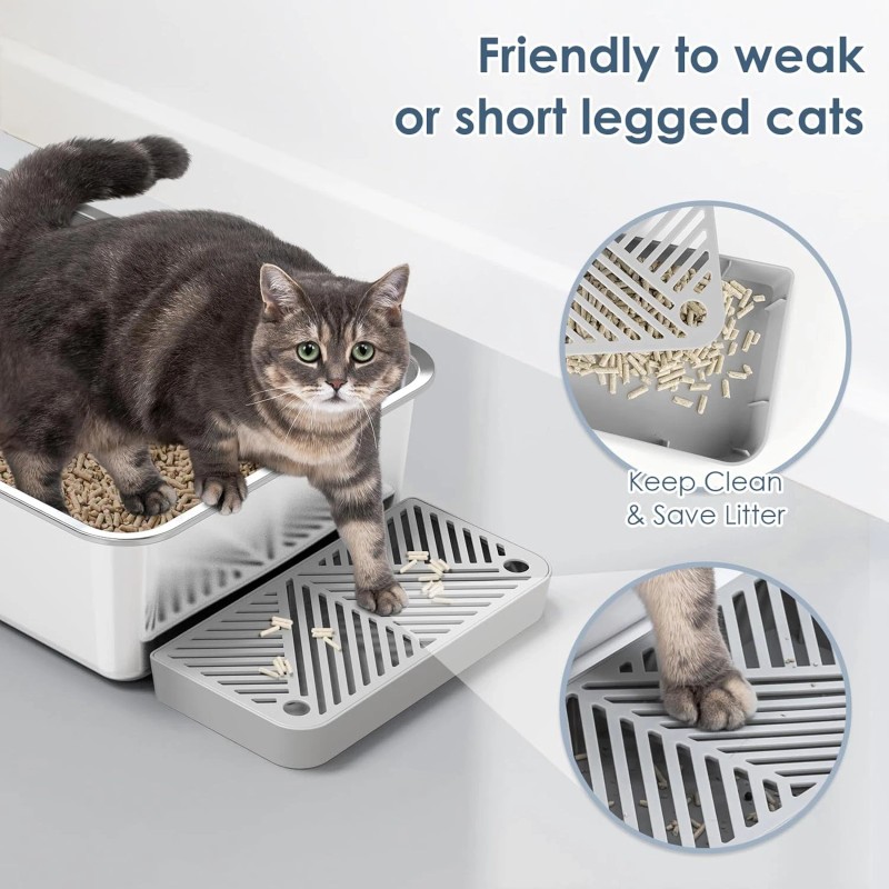 - Help Contain Litter Spread: This stainless steel litter box XL comes with a foot board designed to collect litter from your cat's paws, keeping your floors clean and saving on litter usage. The foot board on the floor make it easy for older or short-legged cats access to the litter tray effortlessly