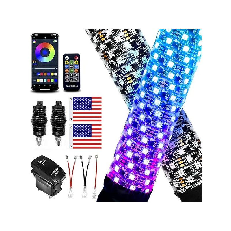 Special Feature:Customizable Flash Patterns, APP Control,RF Remote, LED Dense Design, Customizable Music Modes,2ft fat Spiral LED Whip Lights, Rust Proof, Dust Proof