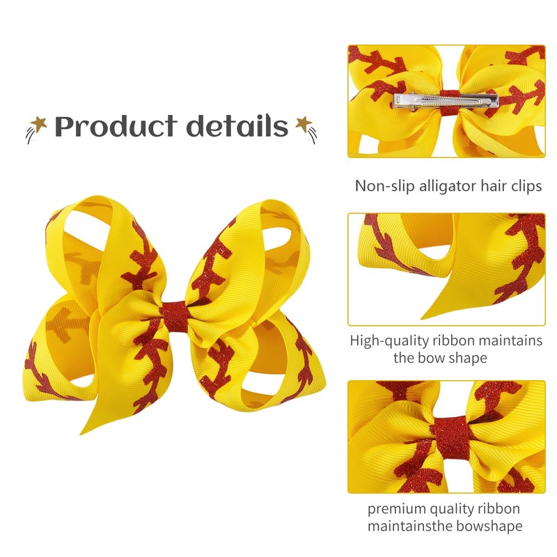 - 2-Pack Softball Hair Bows: Comes with 2 matching bows (1 pair) in bright yellow grosgrain with red glitter “stitch” detail—cute alone or as pigtail bows. Easy to mix and match with everyday outfits and team uniforms.