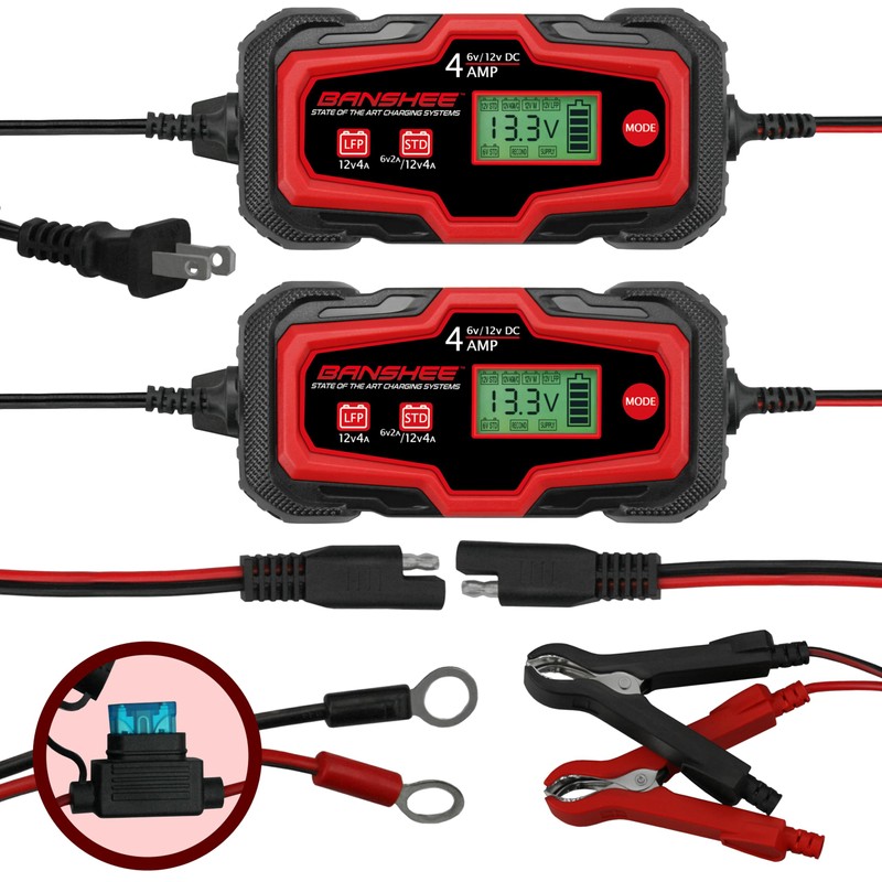 - Our 4 Amp smart charger is versatile, compatible with 6 Volt/12 Volt Standard Wet/Flooded Lead Acid Batteries, 12 Volt AGM (Absorbed Glass Mat) Lead Acid Batteries, and 12 Volt LiFePO4 Batteries; All of any capacity from 4-120Ah. It efficiently charges batteries for cars, motorcycles, ATVs, RVs, boats, scooters, golf carts, lawn mowers, ride-on toys, and more.
