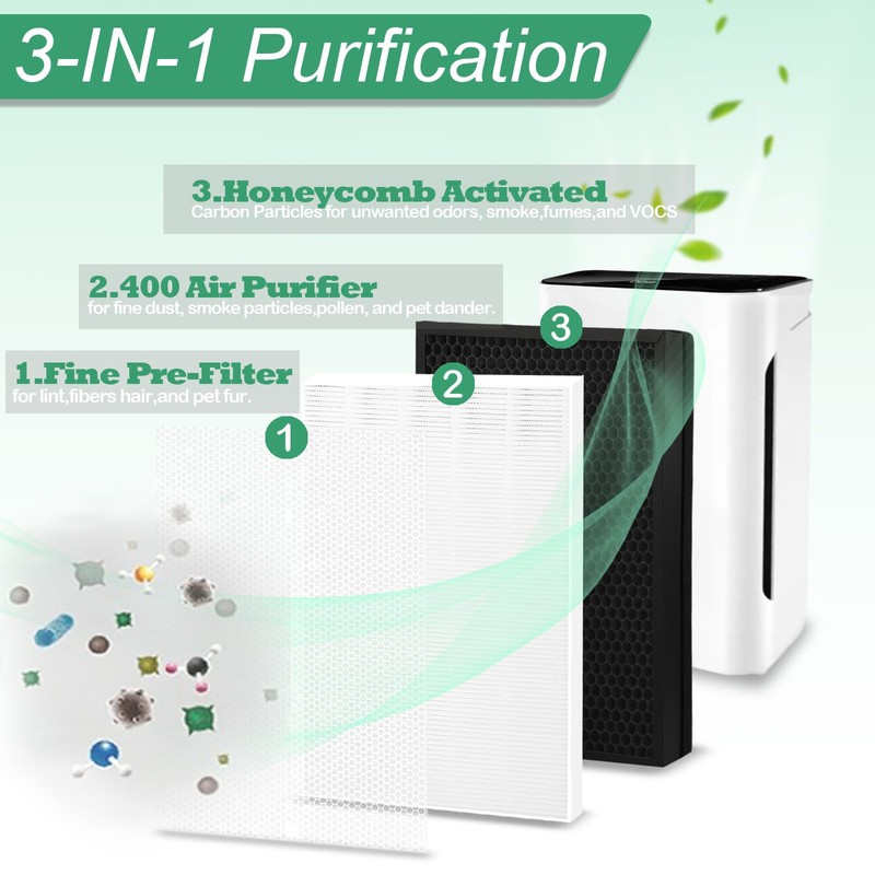 - HIGH PERFORMANCE: The 400 replacement filter can effectively remove airborne particles, improving the quality of indoor air and making people breathe freely; The high-grade activated carbon filter can efficiently absorb unwanted odors, fume and cooking smells, as well as filter pet odors in your living space for improved air quality, ideal for pet owners, smokers, and people who live in cities.