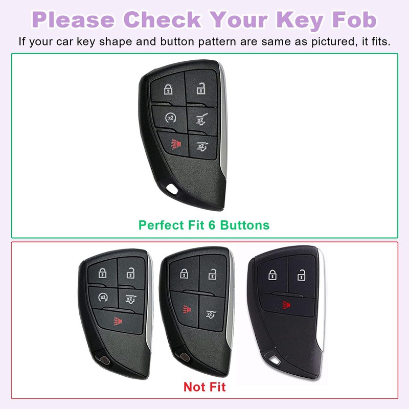 • Fit for GMC/Chev: PIFOOG 2 pack TPU purple car key fob protector covers snugly fit for GMC Yukon 2021 - 2024, GMC Yukon Denali 2021 - 2024, GMC Yukon XL 2021 - 2024, GMC Yukon XL AT4 2021 - 2024, GMC Yukon XL 1500 2021 - 2024, Chev Tahoe 2021 - 2024, Suburban 2021 - 2024, Suburban 1500 2021 - 2024, Silverado EV 2024 2025, Not fit for 2021 - 2024 Tahoe LS,2024 GMC Yukon SLE. (Kindly Note: The car model is for reference only. Pls confirm your car key shape and button patterns same as pictured before purchase.)
