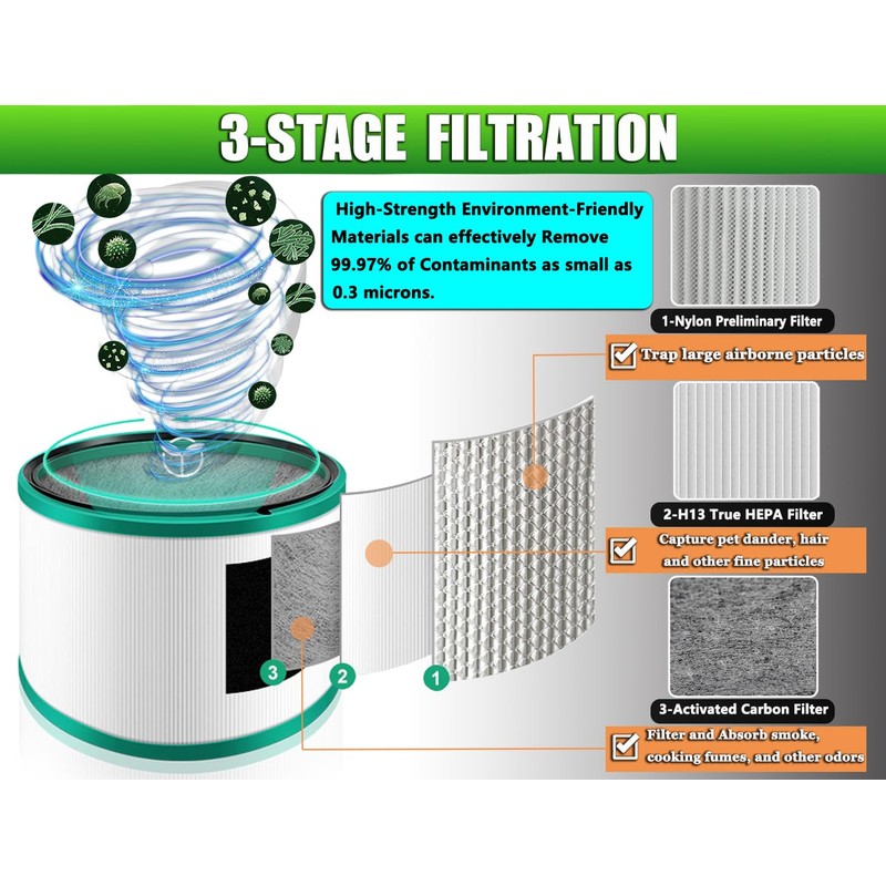 - High-Efficiency Absorption: TIKTH 360° Combi Glass HP01 HP02 HEPA Carbon Air Purifier Filter for Dyson Pure Hot+Cool Link HP01 HP02 HP03 purifying heater + fan & Pure Cool Link DP01 DP02 DP03 desk fan, Filter 99.97% of air impurities as small as 0.3 microns. Effectively Absorb fine dust, pets hair, cooking fumes & smoke other odors. Improve the Air Quality and Let your Whole Family Enjoy a Clean and Healthy House Scene.