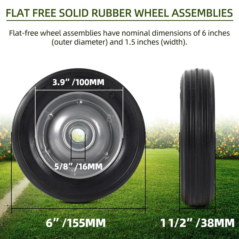 - AR-PRO 6” X 1.5” FLAT FREE SOLID RUBBER WHEEL ASSEMBLIES - These sets of flat-free wheel assemblies have nominal dimensions of 6 inches (outer diameter) and 1.5 inches (width). The actual dimensions are 6.14 inches outer diameter, 1.45 inches overall width, 3.9 inches rim diameter, and 1.5 inches tread width.