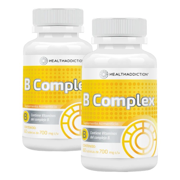 El B-Complex de Health Addiction en presentación de 2 frascos con 60 tabletas cada uno, ofrece un suplemento vitamínico de alta calidad diseñado para recargar tu cuerpo y mente. Contiene todas las vitaminas esenciales del complejo B, fundamentales para el metabolismo energético, la salud neurológica y el bienestar emocional.