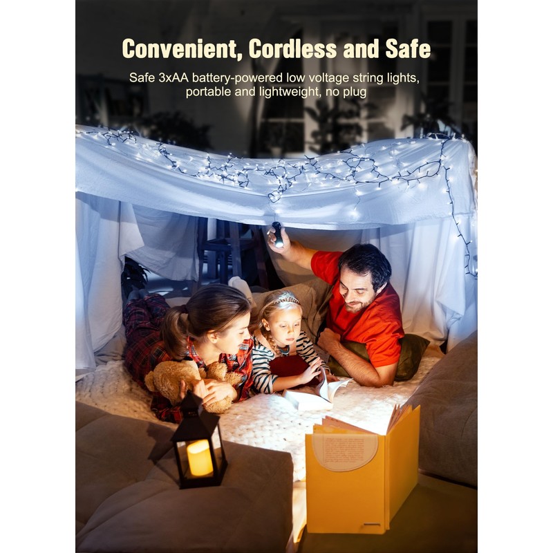 - Energy Efficient Lights : This string lights are durable, made of premium cable with energy-efficient LED bulbs, it is bendable and sturdy wire with LED lights is waterproof. Press the button on Christmas lights battery case to power on, and to activate 6 hours lighting and 18 hours off mode, no worrying about forgetting to switch off the lights