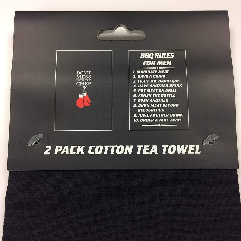 2 Pack Black Cotton Tea Towels 1 x Don't Mess With The Chef & 1 x BBQ Rules For Men