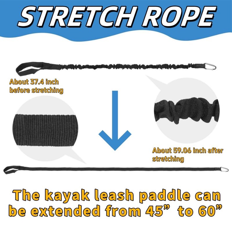 - 【Stretch design】Unique and beautiful lightweight accordion webbing design .The kayak leash paddle can be extended from 39.4 inch to 59 inch, which is long enough for most usage. 20" of elongation keeps you reach what you need when paddling or reeling to a large extent.Excellent kayak accessory to allow flexibility and maneuvering.Fixed elongation, Will not over stretch and loose elasticity.