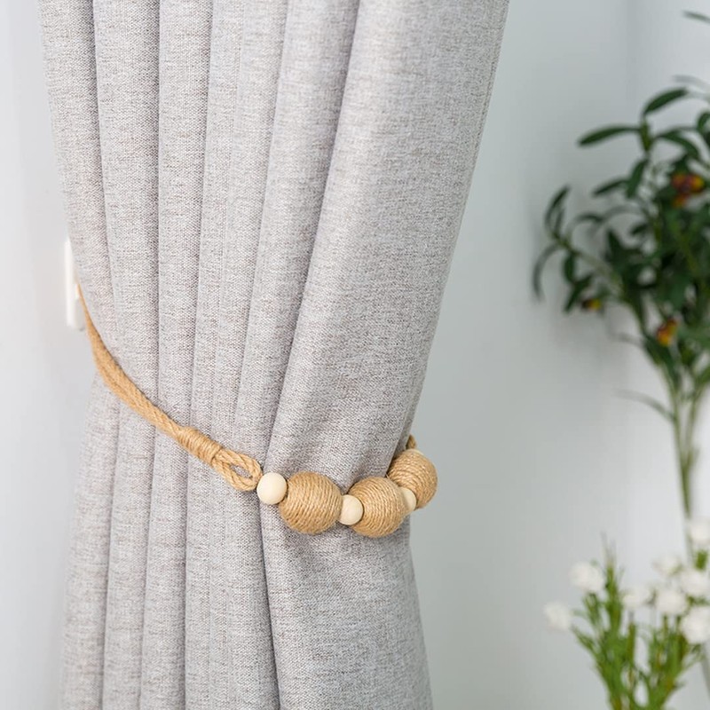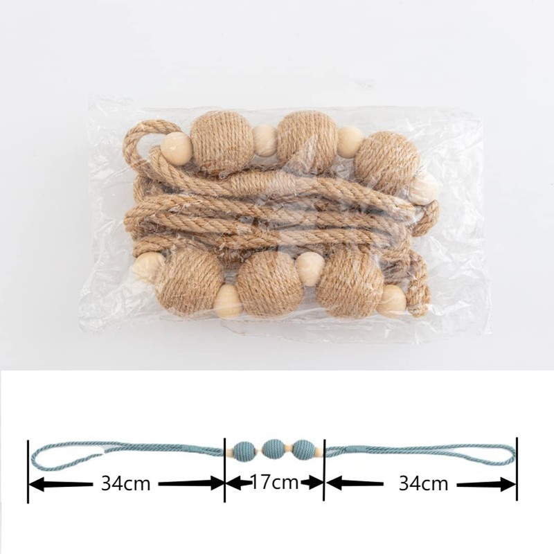 - Size: The length of this coil ball curtain tie back is ca. 33.46 inch/85 cm in total. Each woven rope is ca. 13.39 inch/34 cm in length. The part of wood beads and jute coil ball is ca. 6.69 inch/17 cm in length.