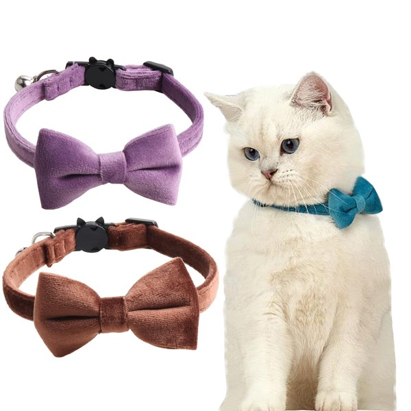 2 Pack Breakaway Cat Collars with Bell and Bowtie Comfortable Velvet Cat Collar with Cute Safety Buckle Adjustable Pet Collar for Kitty Kitten Puppy Neck Accessories for Daily Wearing Kitten (Brown & Purple)