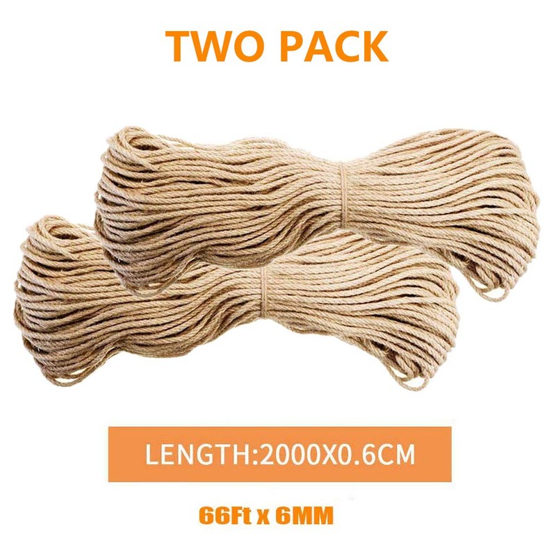 - ✔100%NATUREAL MATERIAL --2PCS-6MM*66FT, Premium natural sisal rope, traditional processing, manual drying, no chemical and oil adding. Cat post rope is suitable for furniture, flowerpot, cat house, sisal cat tree.