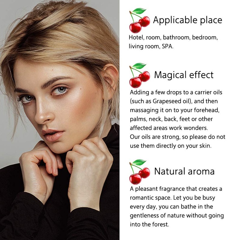- Usages - Used for essential oils diffuser to create an atmosphere. Our Cherry oil can also be used for hair care, massage, bathing, making perfumes, soaps, scented candles and more.