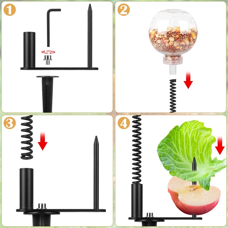 - 【Dual Unique Design】The bottle body is made of transparent plastic, which is lightweight and durable. It is easy to hold food and clean, metal spring is elastic and support swing left and right. The base uses high-quality metal to facilitate fixed in outdoor chicken coop or lawn soil. There are many different types of holes designed on the plastic ball,the ball will shake when the chickens are pecking, and the internal food or snacks will fall to the ground easily. Added a vegetable and fruit fork, so your chickens can eat grain feed and enjoy the delicious vegetables and fruits.