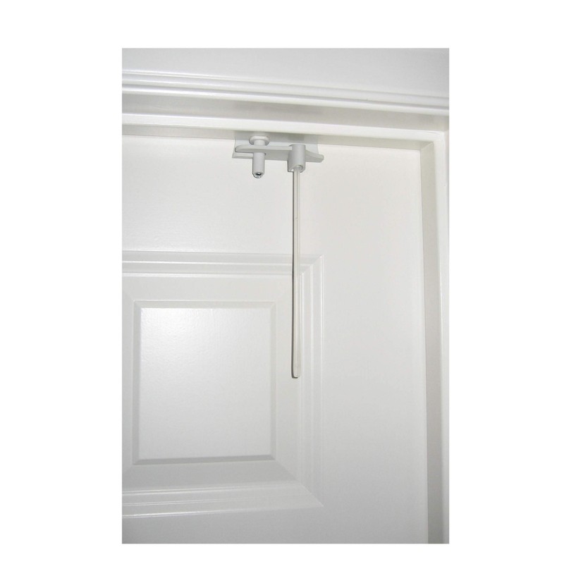 - RESTS ON TOP OF THE DOOR AND SUPER EASY TO INSTALL AND USE: All it takes is one small peg that mounts to the door frame. The lock rests on the door and slides back and forth to lock and unlock the door. There's even a wand for shorter adults who can't reach the top of the door. Locks and unlocks from either side of the door.