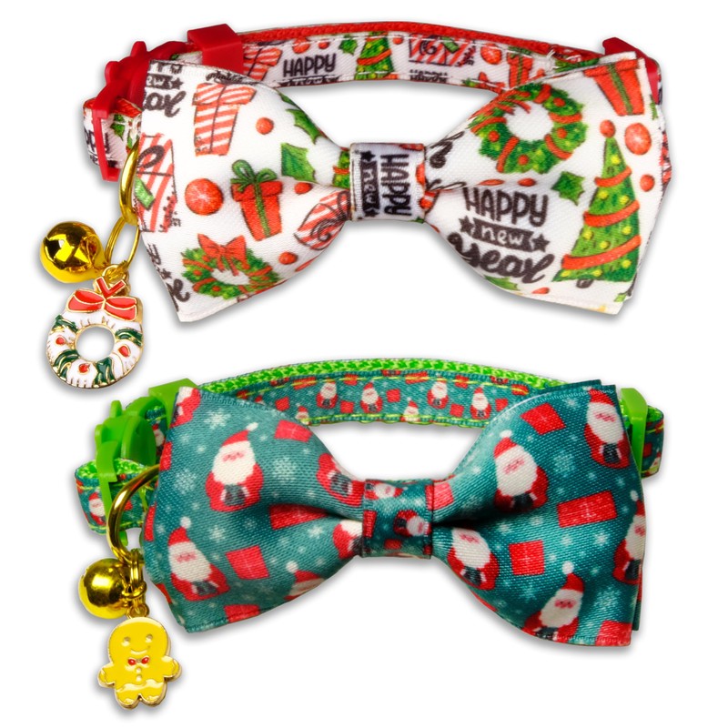- 🎁 Festive Double Delight Christmas cat collar set includes two holiday-themed designs: a white collar adorned with Christmas elements like gifts, trees, and wreaths along with the words “Happy New Year,” and a green collar featuring Santa Claus and gift boxes, adding a joyful holiday touch. Perfect for male or female pets, indoors or outdoors, to make your pet stand out in festive style.