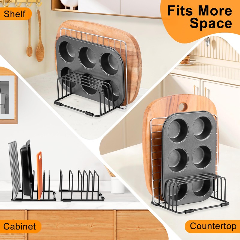 - Versatile Use - Besides being a dedicated cutting board stand, this rack can be used in multiple ways. It can serve as a bakeware organizer, keeping your cookie sheets, muffin tins, and baking pans in order. Place it in your RVs, kitchen cabinet, on the countertop, or even den to keep your items organized and accessible.