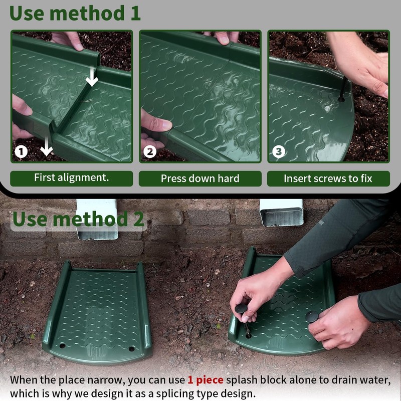 - 🌧【Widely Used】Splash block is suitable for all types of downpipes! Two-stage split design - 1 piece splash block can be used independently to meet the needs of smaller space. Tips: This DARK GREEN splash block is more suitable for being placed in SOIL, color is low profile, integrated with the soil. If it needs to be placed on the LAWN, it is recommended to use GRASS GREEN.