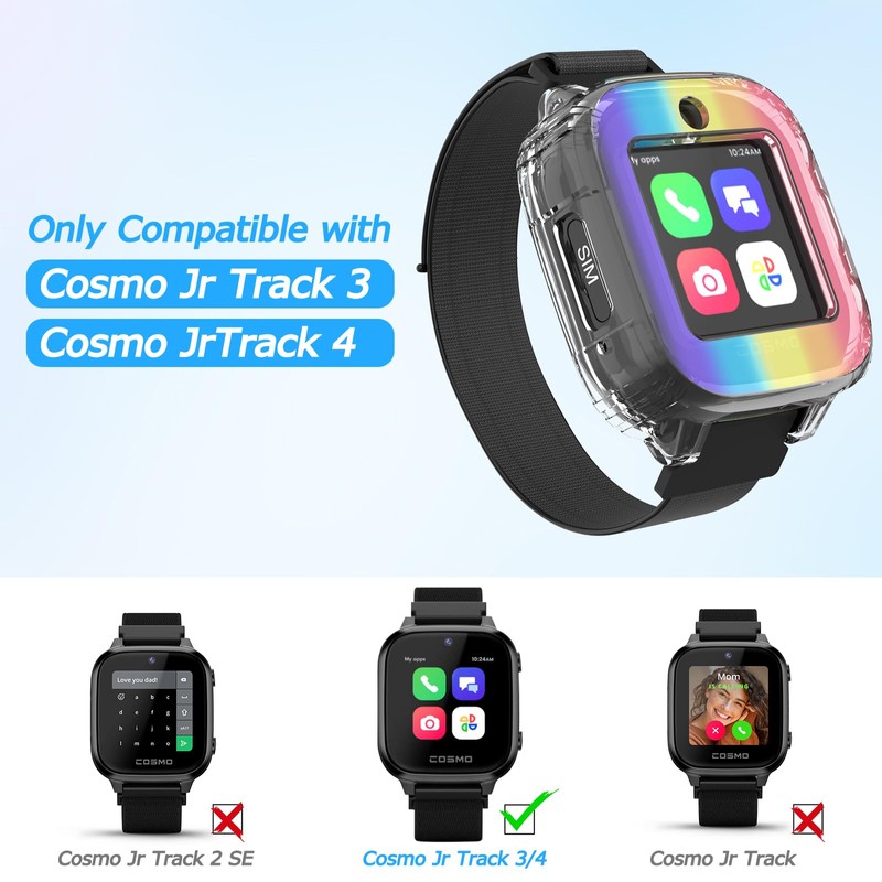 - [Flexible and Soft TPU Material] The Cosmo JrTrack 3 & JrTrack 4 Kids Smartwatch case is made of soft TPU material with ultra-light weight which is harmless to your body. It protect your device from scratches, fingerprints, accidental drops, shocks and bumps.