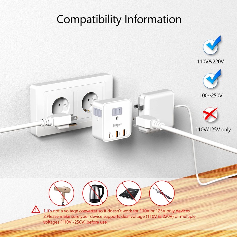 - 6-in-1 Plug Adapter: This European travel plug adapter takes up one EU socket,expands it into 3 US sockets and 2 USB-A 1 USB-C ports,allowing you to charge 6 devices simultaneously.Ideal for mobile phone,tablet, power bank and other electrical chargers;Compared to other versions, the 20 W PD 3.0 and Quick Charge 3.0 ports can provide faster and safer charging.