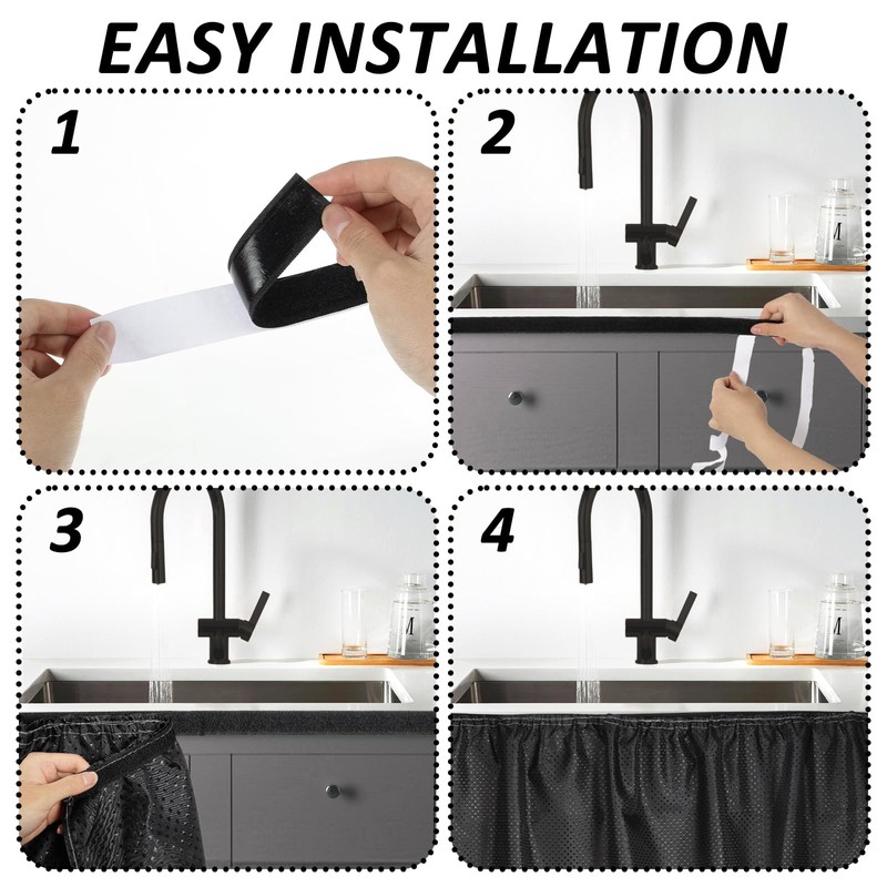 - Waterproof & Easy to Clean: Made from durable, waterproof polyester fabric, this under sink skirt with adhesive tape is both stylish and practical. The bathroom sink skirt prevents items from getting damp and helps avoid water stains. Cleaning is a breeze – simply wipe it with a damp cloth.