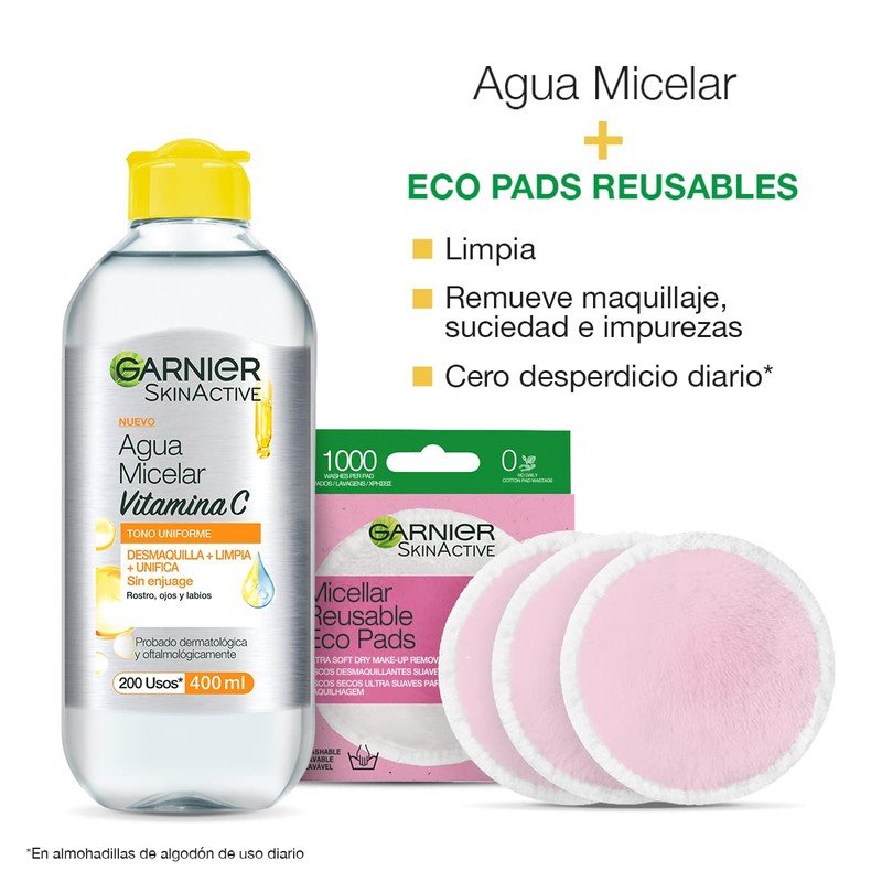- Limpia, remueve maquillaje, suciedad e impurezas, al mismo tiempo que reduces tus desperdicios diarios con el bundle de Agua Micelar + Ecopads reutilizables de Garnier.