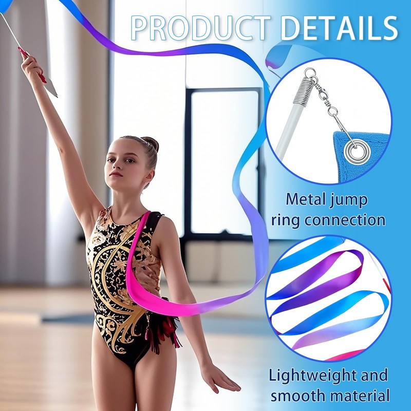 - Beautiful Gradient Dance Ribbons: This set includes 2 stunning 78.7-inch gradient dance ribbons, designed to shine beautifully under lights and sunlight. The long and flowing design adds a mesmerizing effect to artistic gymnastics performances.