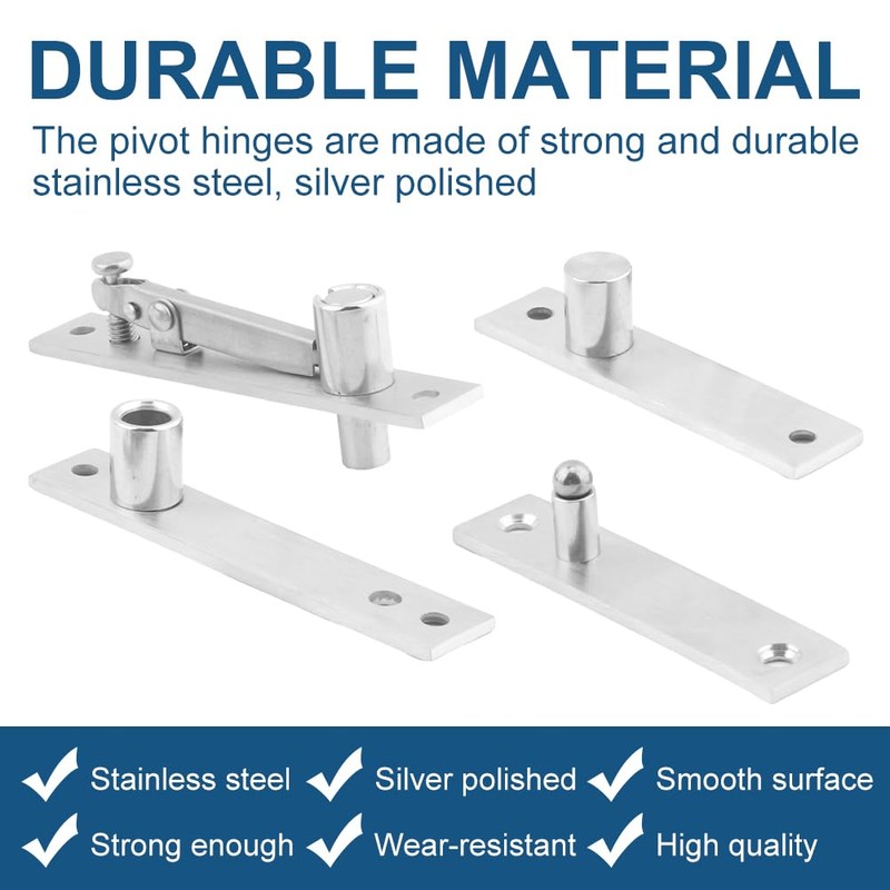 【DURABLE MATERIAL】The pivot hinges are made of strong and durable stainless steel, silver polished, smooth surface, will not hurt your hands, sSrong enough to stably support heavy and wide doors, not easy to deform or break, wear-resistant, long service time.