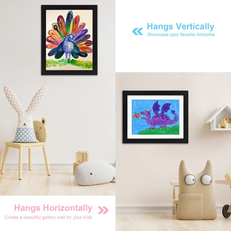 - 【Easy of Use】Our art display frame is designed with a magnetic closure system, making it easy to change out photos or artwork. In addition, there are two sets (four) hooks on the back of the frame that allow for horizontal or vertical hanging to best display your child's artwork.