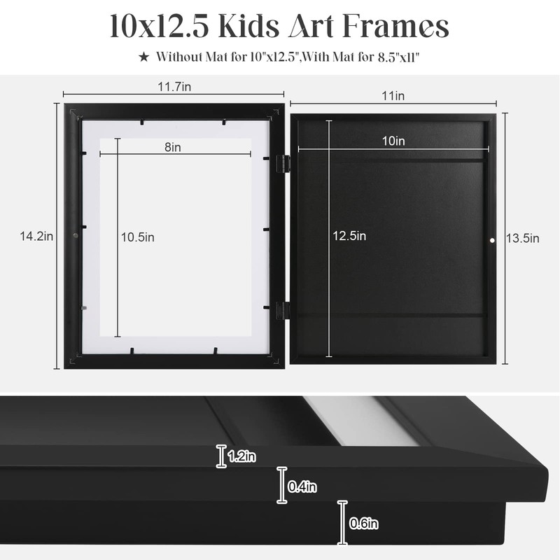 - 【High Capacity】Perfectly suited for 10x12.5 inch artwork without mat or 8.5x11 with mat; the actual mat opening is 8x10.5 inches. Our frame has a depth of 0.6 inches, making it capable of holding 50-150 pieces of children's artwork depending on paper thickness. Store and showcase your child's artwork all in one place.