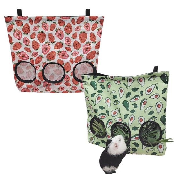 - 【Value Set】This package contains 2 pieces rabbit hay feeder bags with 3 holes: 1 pc strawberry and 1 pc avocado Pattern, each hay bag is equipped with 2 metal buckles that you can hang the hay bag on the pet cage or other places with hooks, convenient and portable for you to apply.
