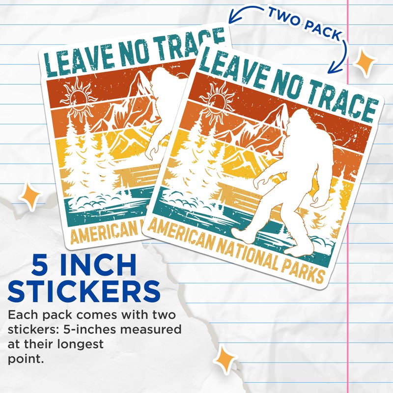 (2 Pack) Leave No Trace Stickers - American National Parks Stickers - Bigfoot Adventure Stickers - 5" On Longest Side - Sticks to Any Smooth Flat Surface - Made in USA - BMCS3363