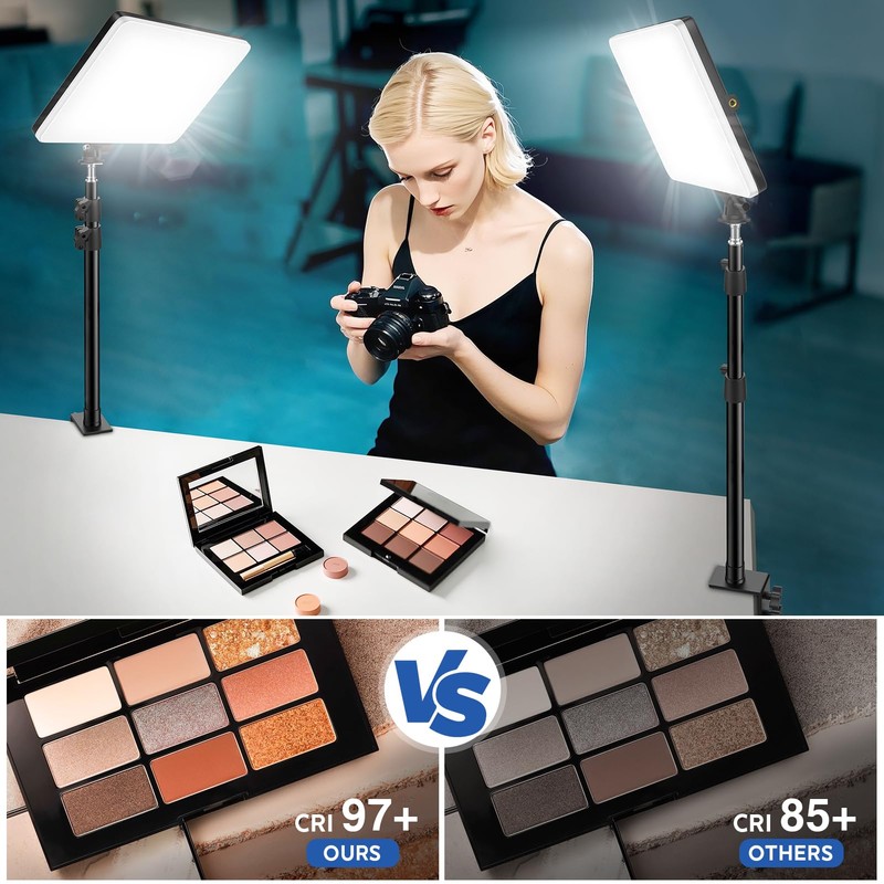 - Universal Multi Compatibility: Suitable for a variety of purposes such as photography, video recording, makeup, live streaming, YouTube videos, and TikTok. Also Good fit for indoor/studio portraits, and product shots of larger objects. What you get: 2* LED Video Light, 2* Hot Shoe, 2*Tabletop Clamp Mount Stand, 2*AC/DC power adapters, 1*User Manual