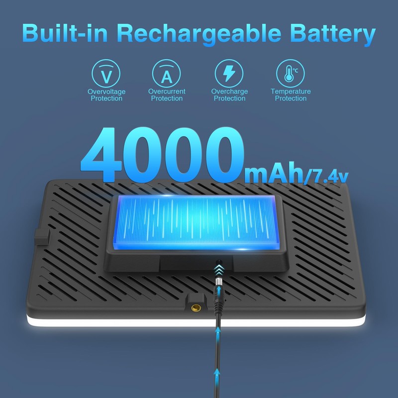 - Battery-operated, Fast charging: Built-in rechargeable 2*4000mAh battery adds to the portability of this video light. This eliminates the hassle of dealing with tangled cords and limited mobility, allowing you to position the lights freely without being tethered to power outlets. At full brightness, 120 minutes continuous run time. Need charged for 2h in order to get a full, complete charge