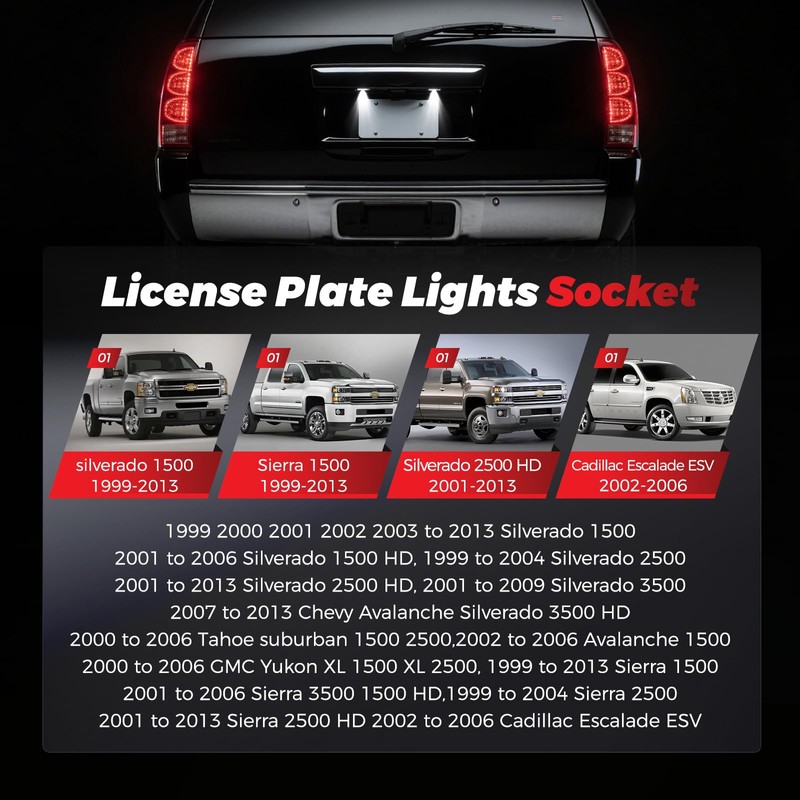 - 【Wide Compatibility】Compatible with 1999-2013 Silverado 1500 2001-2006 Silverado 1500 HD 1999-2004 Silverado 2500 2001-2013 Silverado 2500 HD 2001-2009 Silverado 3500 2007-2013 Chevy Avalanche 2000-2006 Tahoe 2002-2006 Avalanche 2000-2006 GMC Yukon XL 1999-2013 Sierra 1500 2001-2006 Sierra 3500 1999-2004 Sierra 2500 2001-2013 Sierra 2500 HD 2002-2006. Fits gmc license plate setups with integrated silverado license plate light harness and license plate light socket