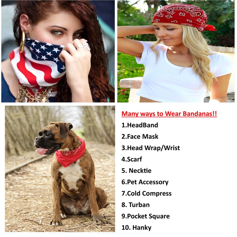 - Many Possibilities: Our bandanas comes in many color options that can be useful and to combine with various outfits, decorations & more! It's an all time favorite that will provide you many ways to wear and colors to choose from, you can mix and match! Have fun and get criative. Wear at the beach, vacation, games, parties, school, work & more! They go beyond as a fashion piece to a functional accessory for survival as a signal flag, trail marker, seat cover, napkin, wind protection & more.