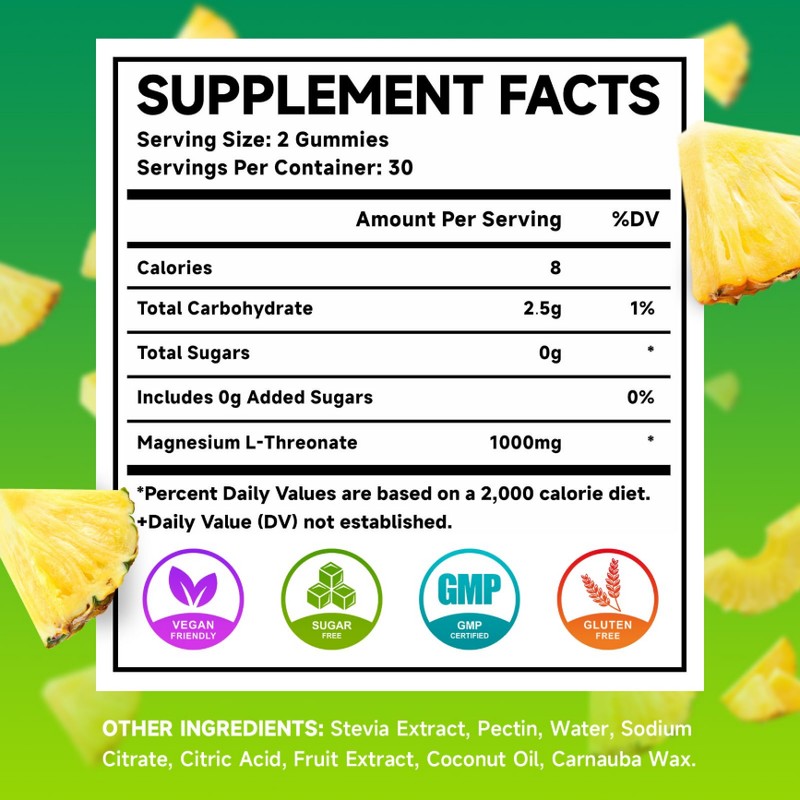 Premium Quality: Our magnesium L-threonate gummies are produced, tested, and packaged in a GMP-certified facility to ensure high quality and consistency. They are vegan, non-GMO, gluten-free, and sugar-free